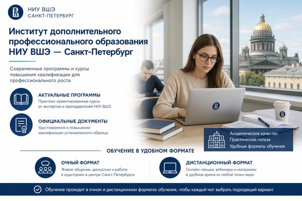 Институт дополнительного профессионального образования НИУ ВШЭ - Санкт-Петербург можно рассматривать как важную образовательную площадку для тех, кто хочет развивать профессиональные компетенции, проходить программы и курсы повышения квалификации и встраивать обучение в реальную карьерную траекторию. В современном мире дополнительное образование стало естественной частью профессиональной жизни, потому что именно оно помогает специалисту оставаться актуальным, гибким и уверенным в своей сфере.
